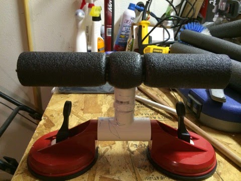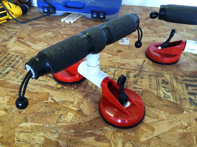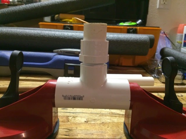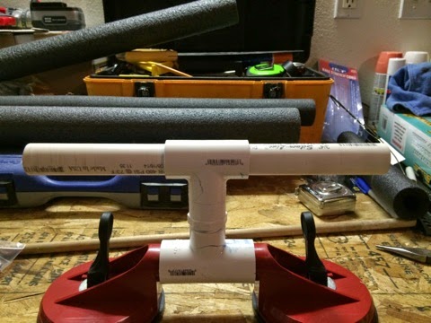 Cut the 3/4″ PVC pipe into equal lengths. Glue them into the PVC tee. I matched the lengths to equal the overall width (or so) of the suction cup lifter.