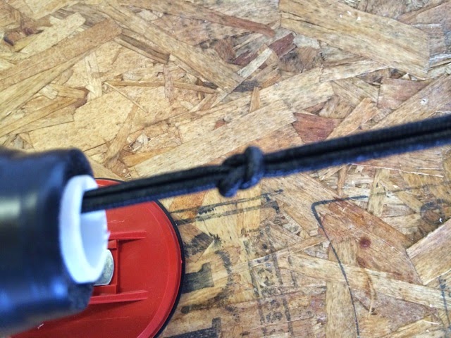 Run one shock cord through the entire length of the PVC pipe covered by the foam. The ball on the end of the cord will prevent it from sliding through the pipe. Tie a second cord to the end of the first. I used a clothes hanger to hook the end of the shock cord and pull it all the way through the pipe.